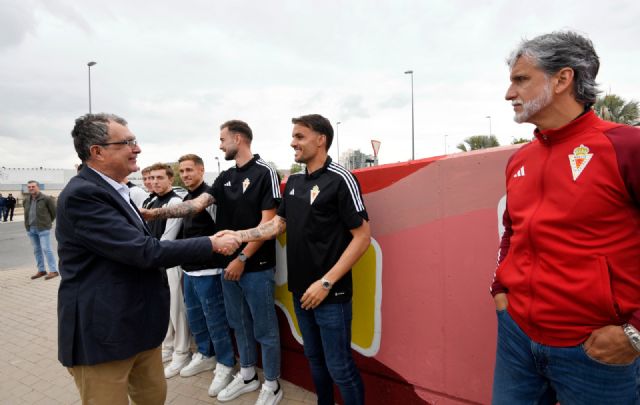 El alcalde de Murcia, José Ballesta, acompañado de la vicealcaldesa y concejal de Fomento y Patrimonio, Rebeca Pérez, el presidente del Consejo de Administración del Real Murcia, Felipe Moreno, y jugadores del primer equipo del Real Murcia, ha presentado esta mañana el mural en homenaje al equipo grana, a su historia y a la pasión de su afición situado en los aledaños del estado municipal Enrique Roca.