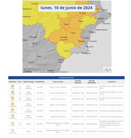 La AEMET actuliza la información sobre avisos de fenómenos meteorológicos adversos en la Región de Murcia.