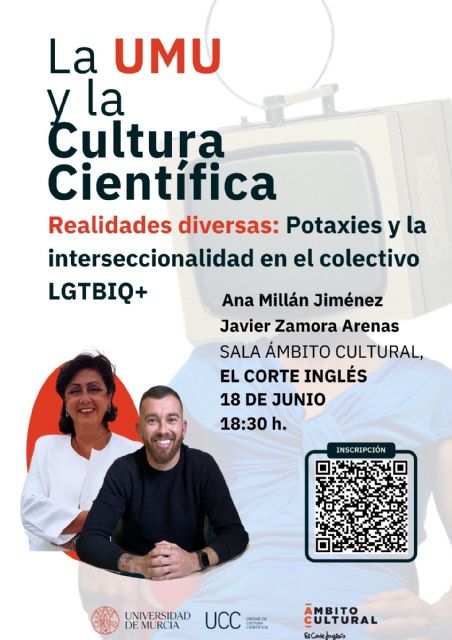 La profesora Ana Millán Jiménez, coordinadora del Servicio de Atención a la Diversidad y Voluntariado y directora de la Cátedra Gestión de la Diversidad, impartirá junto a Javier Zamora Arenas, técnico del Servicio de Atención a la Diversidad y Voluntariado y miembro de la cátedra de Gestión de la diversidad, la última conferencia del ciclo 'La UMU y la Cultura Científica' titulada: Realidades diversas: Potaxies y la interseccionalidad en el colectivo LGTBIQ+. El próximo 18 de junio a las 18:30 horas en la Sala Ámbito Cultural de El Corte Inglés se explorarán cómo las realidades diversas pueden influir en el acceso a los derechos y oportunidades, y cómo distintas variables pueden impactar en el desarrollo personal y social de los jóvenes.