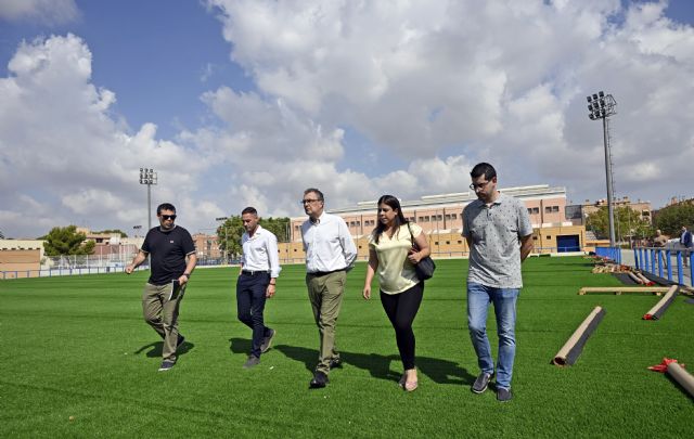 El alcalde de Murcia, José Ballesta, ha visitado las obras del campo de fútbol de Puente Tocinos acompañado del concejal de Deportes, Miguel Ángel Noguera, y de miembros de la Junta Municipal de la pedanía.