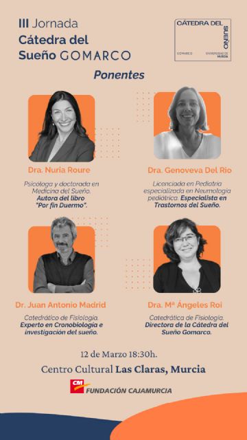 La Cátedra del Sueño Gomarco de la Universidad de Murcia celebra este miércoles, 12 de marzo, sus terceras jornadas de formación y divulgación, sobre calidad del sueño; que este año reúnen a los especialistas Nuria Roure, Genoveva del Río, Juan Antonio Madrid y María ángeles Rol. La cita será en el Centro Cultural Las Claras de Murcia a las 18.30 horas.