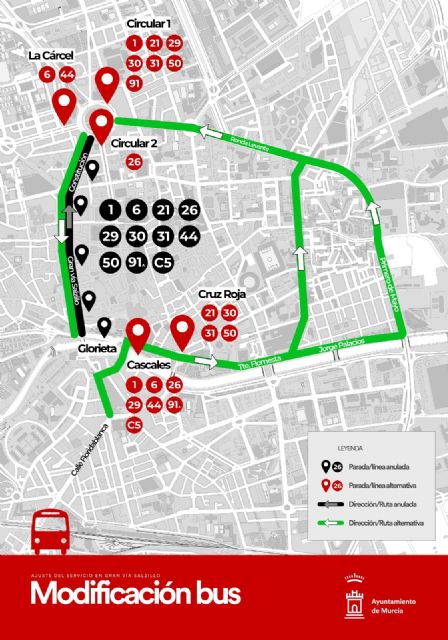 Este cambio afectará a un total de 11 líneas de Murcia y pedanías, cuyo desvío será publicado en las paradas y en la propia web y que se realizará por la pasarela Miguel Caballero, donde girarán a la derecha en dirección a la avenida de La Fama, Ronda de Levante, Plaza Circular y vuelta normal por Gran Vía hacia Martínez Tornel, en el sentido permitido de circulación.
