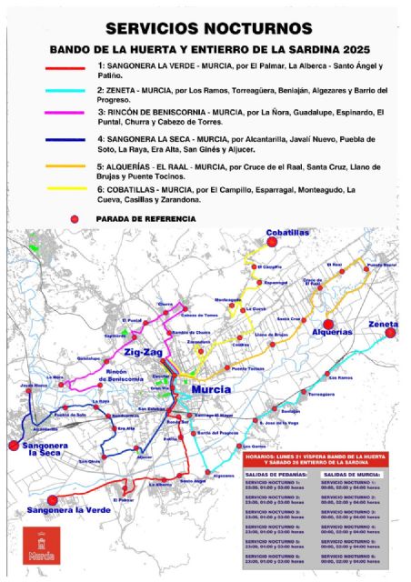 El Consistorio pondrá asimismo en marcha un servicio nocturno de autobuses con destino a las distintas pedanías los días del Bando de la Huerta y el Entierro de la Sardina, por ser las fechas en que los actos festivos se prolongan hasta bien entrada la noche.