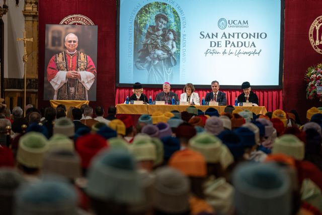 "Se abre la sesión. Doctores sentaos y cubríos". Con estas palabras daba inicio María Dolores García, presidenta de la Universidad Católica San Antonio, al acto académico con el que la institución murciana celebraba esta mañana la festividad de su patrón, San Antonio de Padua. Engalanado para la ocasión, el Templo del Monasterio de Los Jerónimos acogía a su comunidad universitaria, así como a autoridades y representantes de instituciones regionales y nacionales.