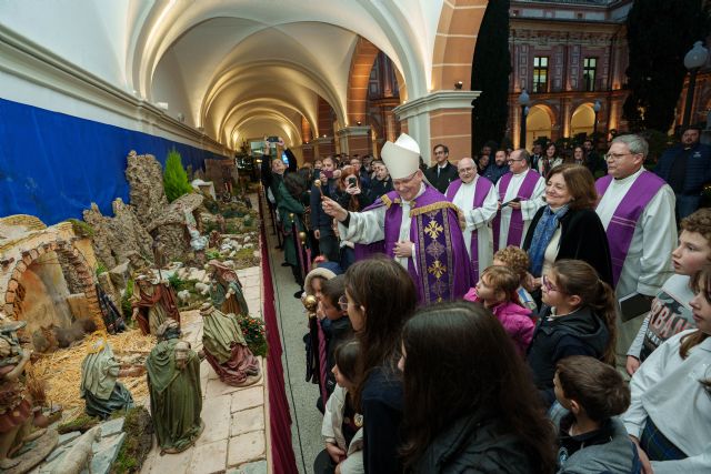 Posteriormente, el obispo ha bendecido el Belén instalado en el claustro del Monasterio de Los Jerónimos, obra de Antonio Pellicer, empleado de la Universidad, donde se han entonado villancicos populares.