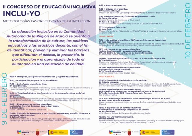 Este evento forma parte del programa 'Inclu-YO', puesto en marcha el pasado curso por la Consejería, en el que participan 280 centros educativos de Infantil y Primaria, y que consiste en generar un proceso de transformación e innovación educativa en los centros que permita promover la inclusión y eliminar las barreras que impiden el acceso, la participación y el aprendizaje del alumnado que presenta necesidades educativas. 'Inclu-YO' pretende mejorar los resultados de éxito educativo dando respuesta a la diversidad del alumnado. La inversión en este proyecto es de seis millones de euros, 1,5 millones anuales hasta 2027.