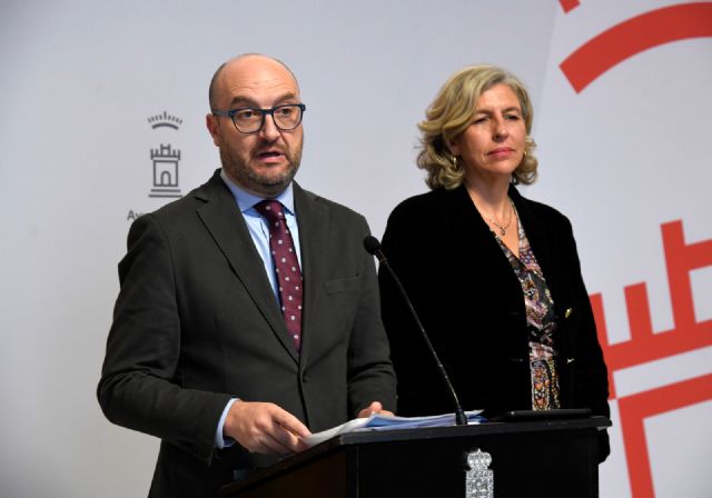 El concejal de Cultura e Identidad, Diego Avilés, presenta las obras de los artistas Joaquín Campos López y Antonio Meseguer Alcaraz, que han sido expuestas en dos grandes paños de la zona de escaleras del museo